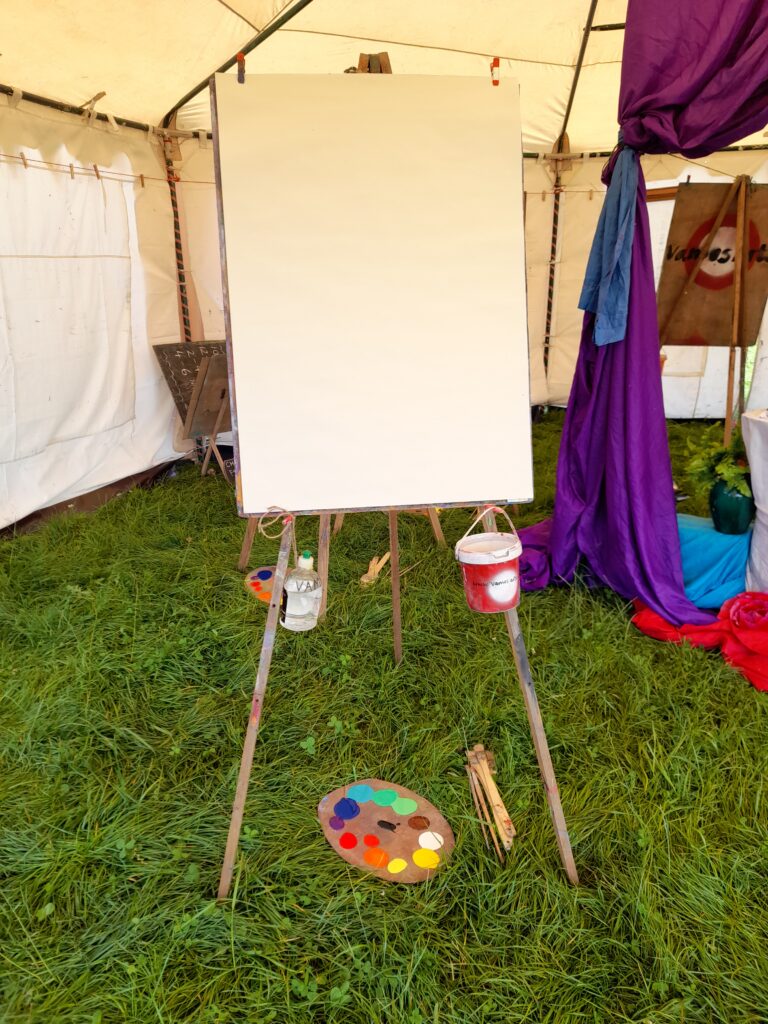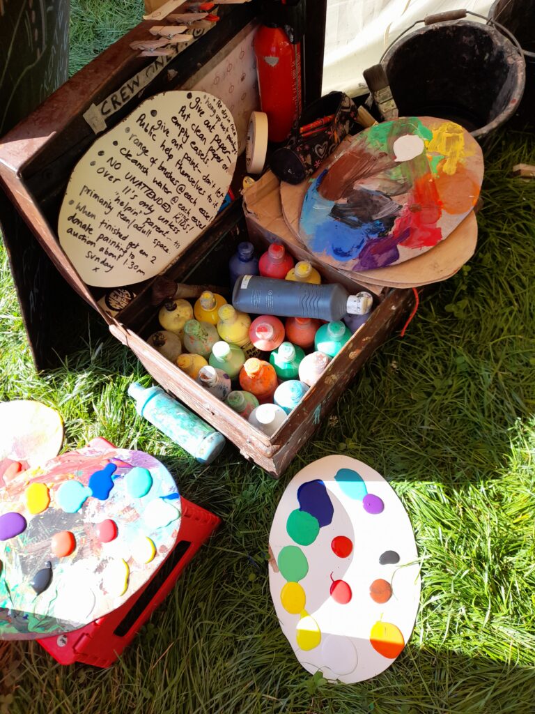 We have a beautiful, spacious and light filled marquee space to house our travelling studio. Enjoy the experience of working on a large scale at one of our many easels. We always have a great range of colourful paint to experiment with, as well as charcoal and pencils.
